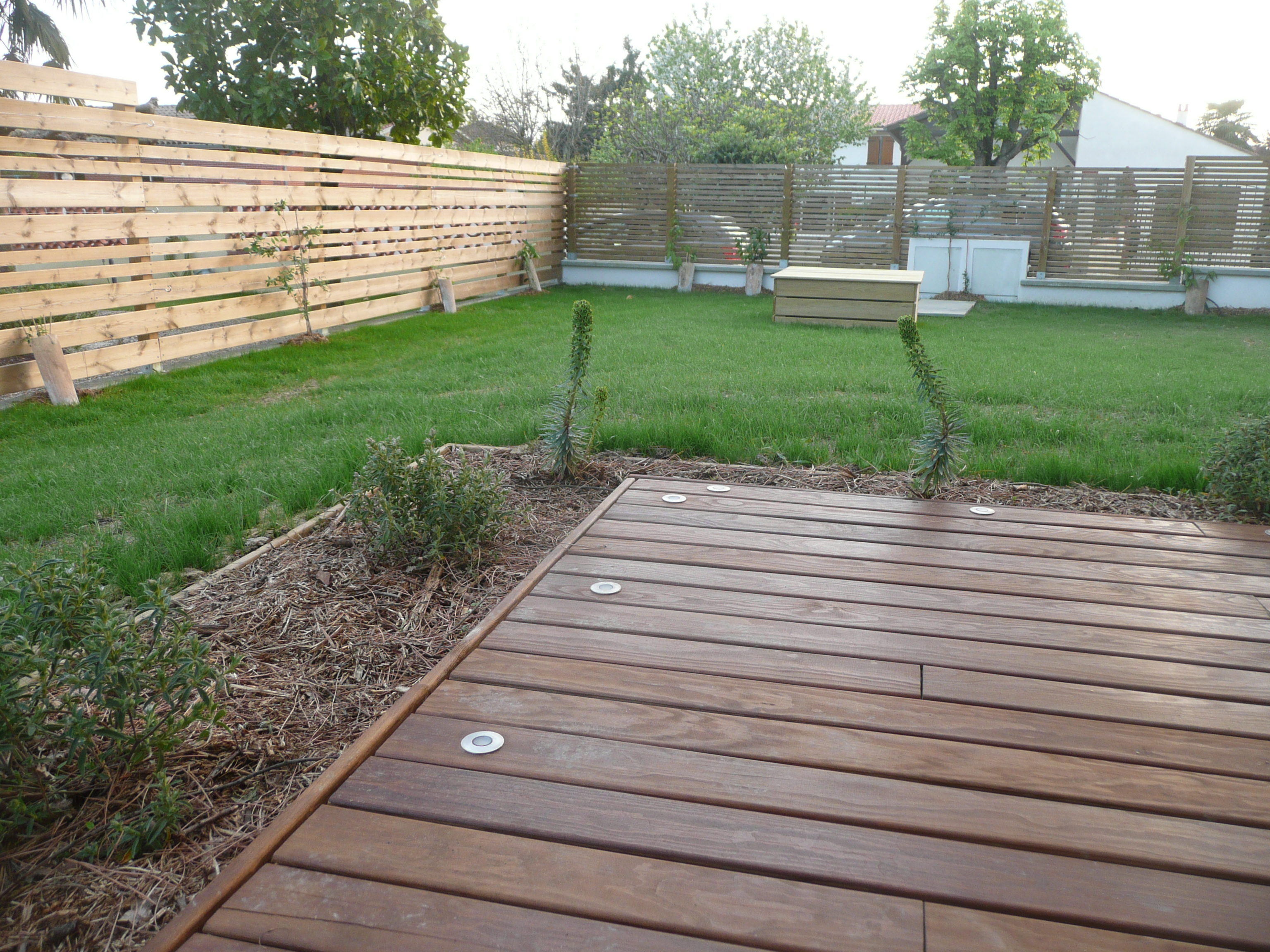 terrasse bois, clôtures et puit