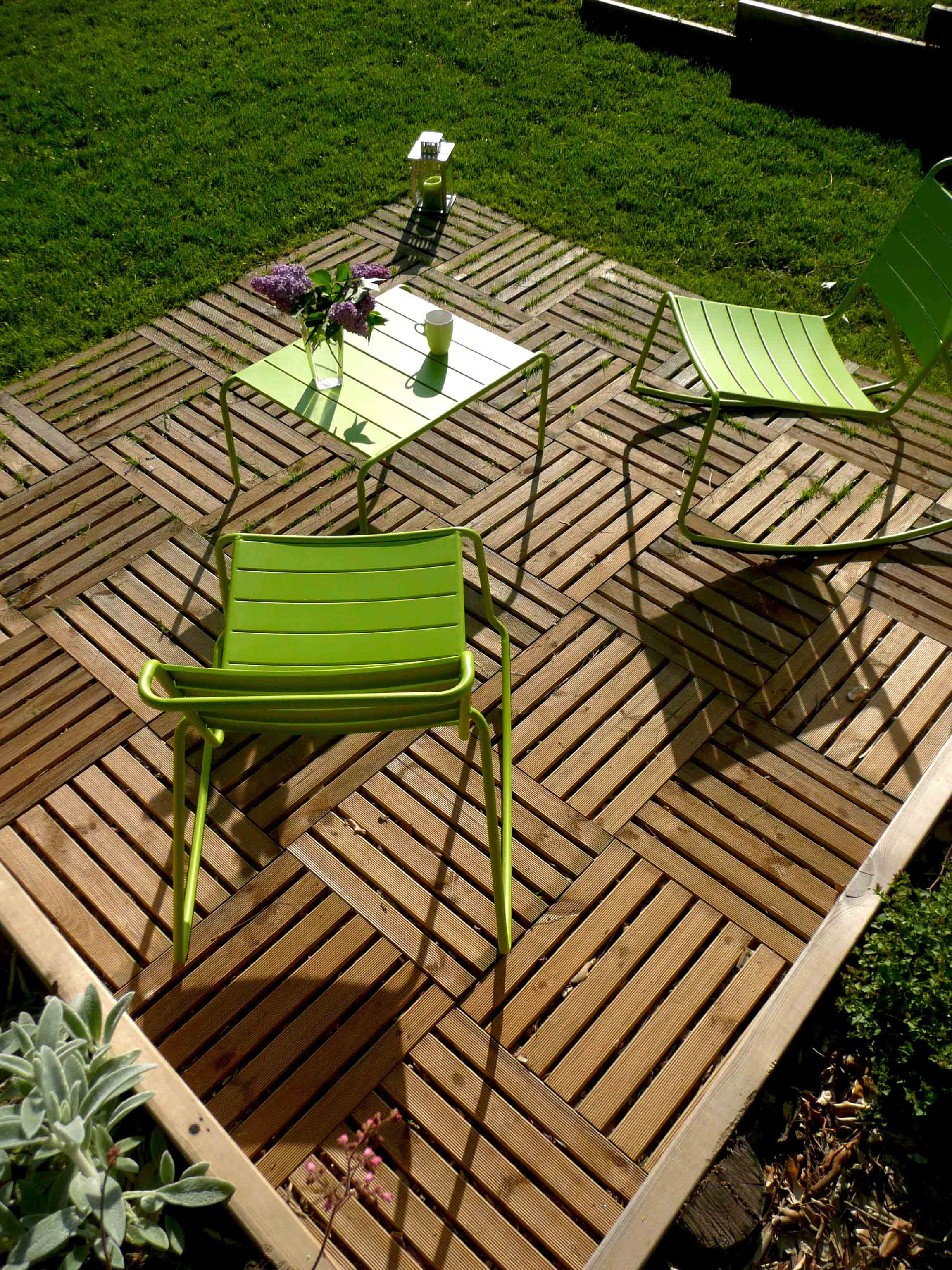 Terrasse bois et salon de jardin coloré