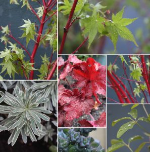 Feuillage, érable japonnais, euphorbe glacier, Akebia, Sedum, Heuchère
