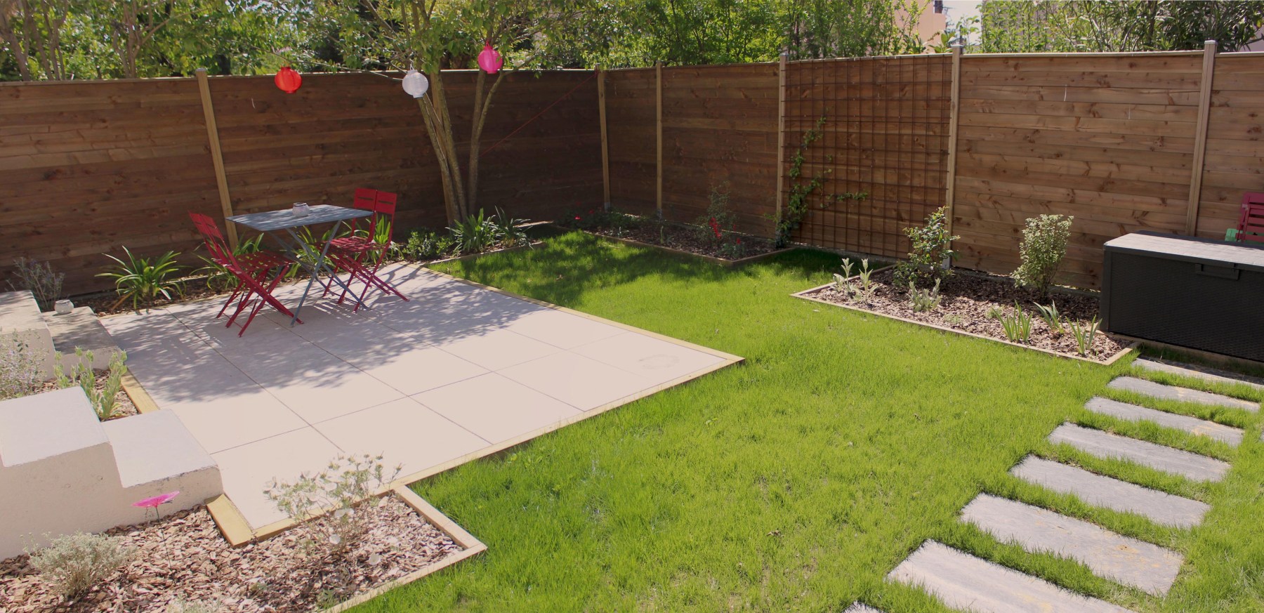Une terrasse au cœur d’un jardin: L’idée est de passer d’une zone bétonnée disproportionnée à une terrasse au cœur d’un jardin. La dalle a été supprimée pour moitié et dallée sur l’autre. L’espace libre disponible pour la végétation est donc agrandi.